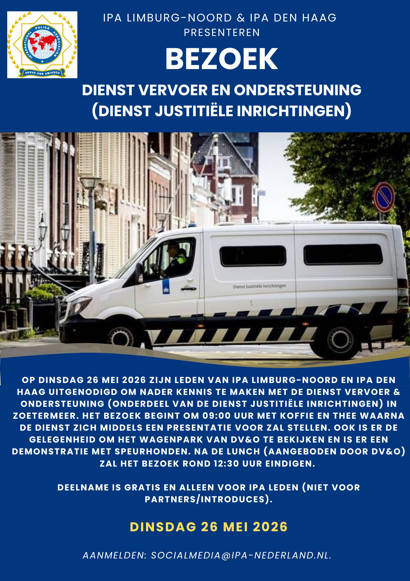 Op dinsdag 26 mei 2026 zijn leden van IPA Limburg-Noord en IPA Den Haag uitgenodigd om nader kennis te maken met de Dienst Vervoer & Ondersteuning (onderdeel van de Dienst Justitiële Inrichtingen) in Zoetermeer. Het bezoek begint om 09:00 uur met koffie en thee waarna de dienst zich voor zal stellen. Ook is er de gelegenheid om het wagenpark van DV&O te bekijken en is er een demonstratie met speurhonden. Na de lunch (aangeboden door DV&O) zal het bezoek rond 12:30 uur eindigen.